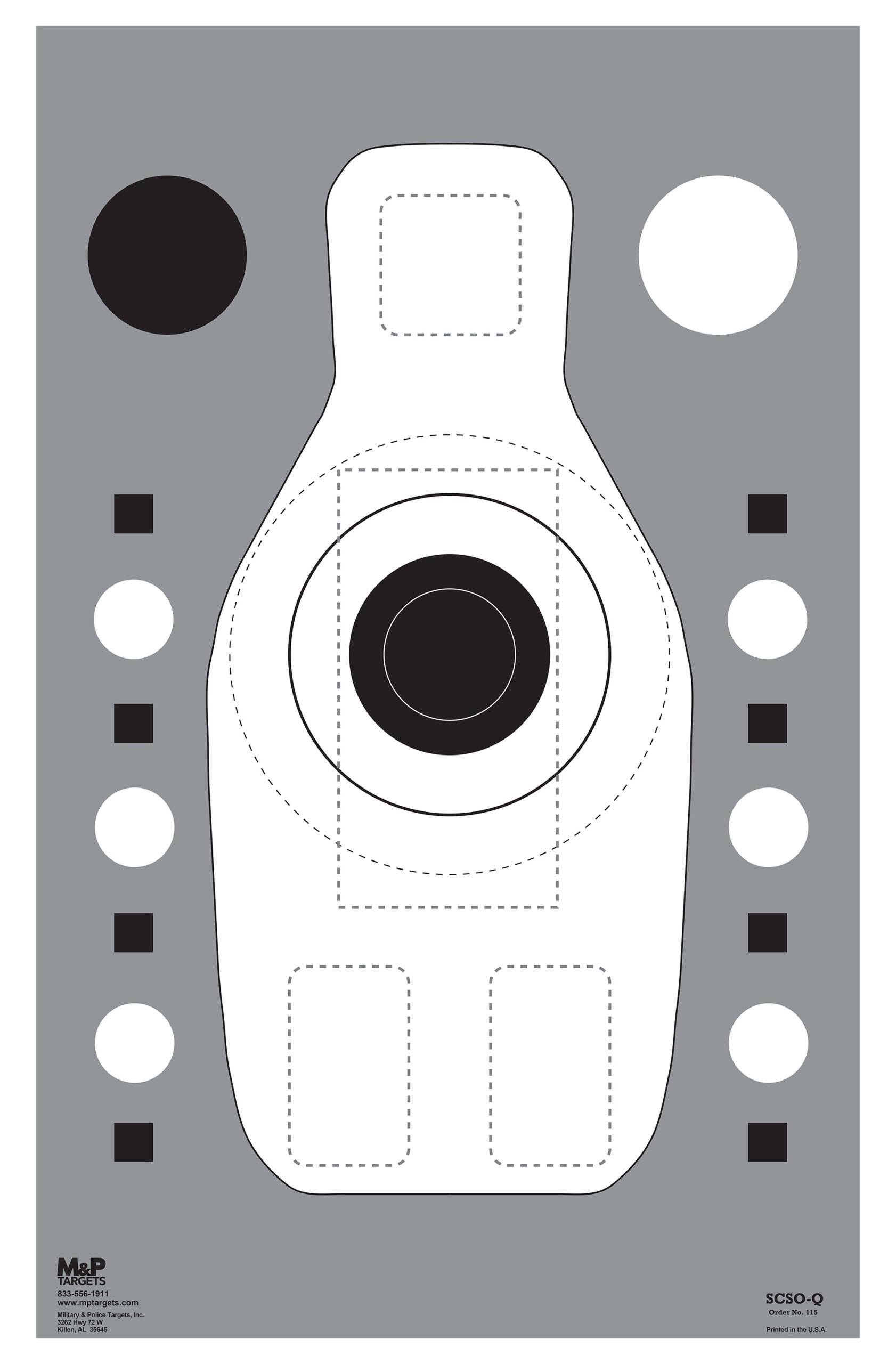 SCSO-Q – A paper shooting target featuring a milk bottle shape with multiple target areas on a grey background.